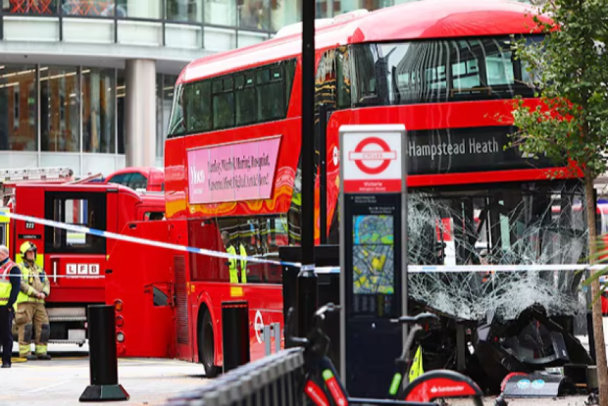 Seventeen people have been injured after a Route 24 double-decker bus mounted the pavement and crashed near Victoria Station in central London this morning.