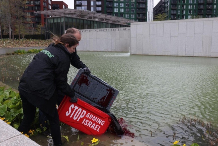 London, April 10, 2025 – Six Greenpeace activists, including co-executive director Will McCallum, were arrested today following a bold protest at the U.S. Embassy in Nine Elms, London. The arrests came after the group poured 300 litres of blood-red biodegradable dye into the embassy's pond, symbolizing the bloodshed in Gaza, which Greenpeace attributes to U.S. arms sales to Israel.